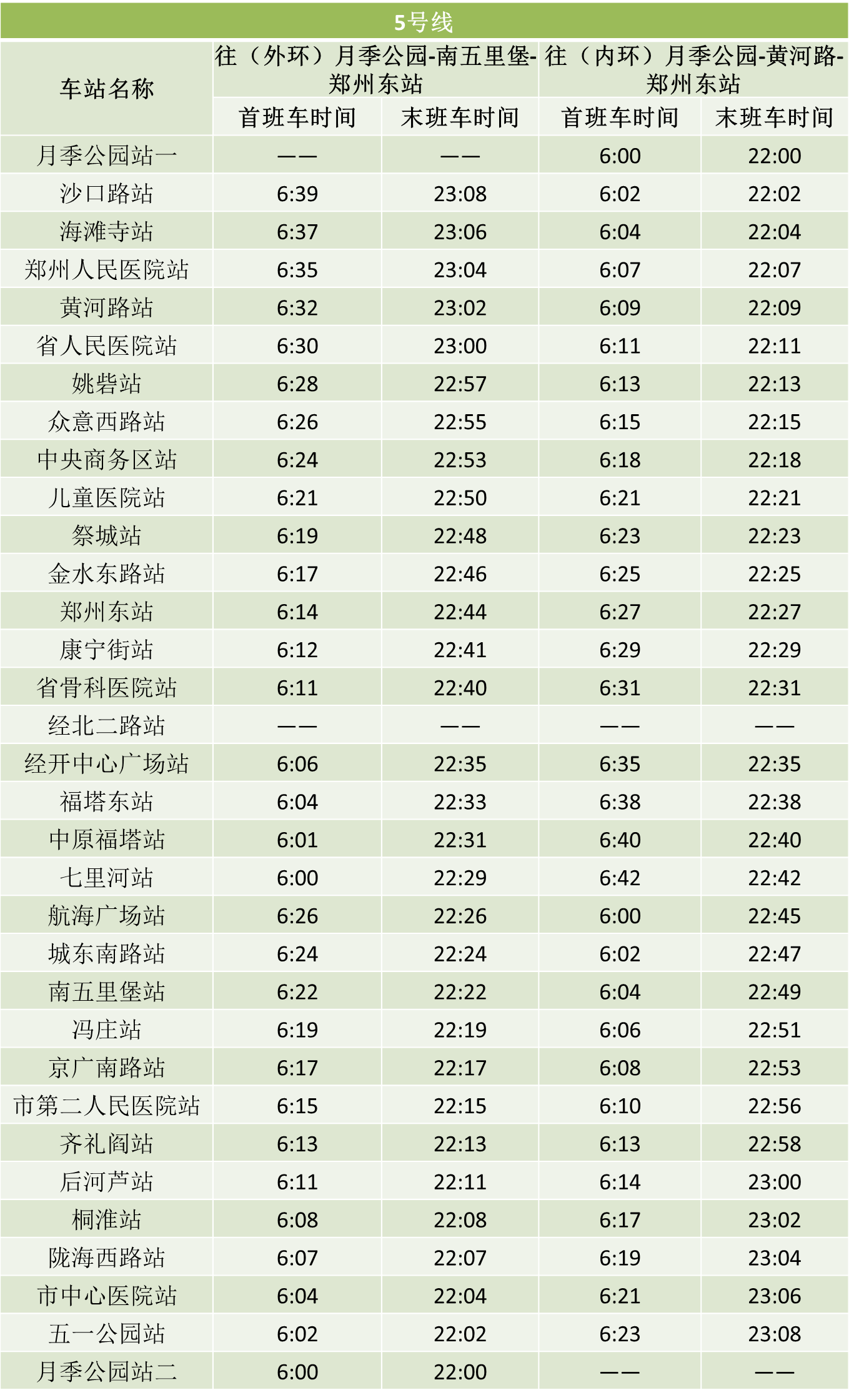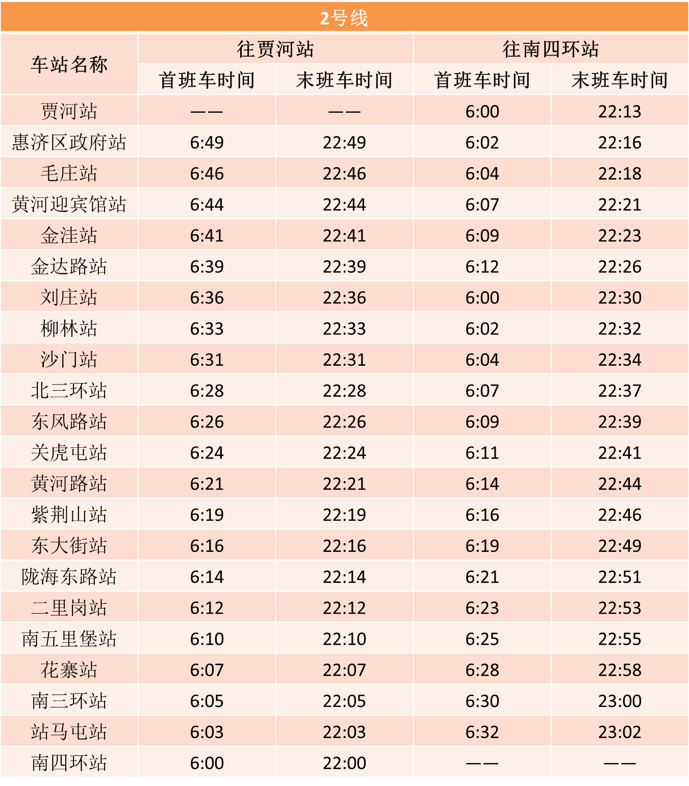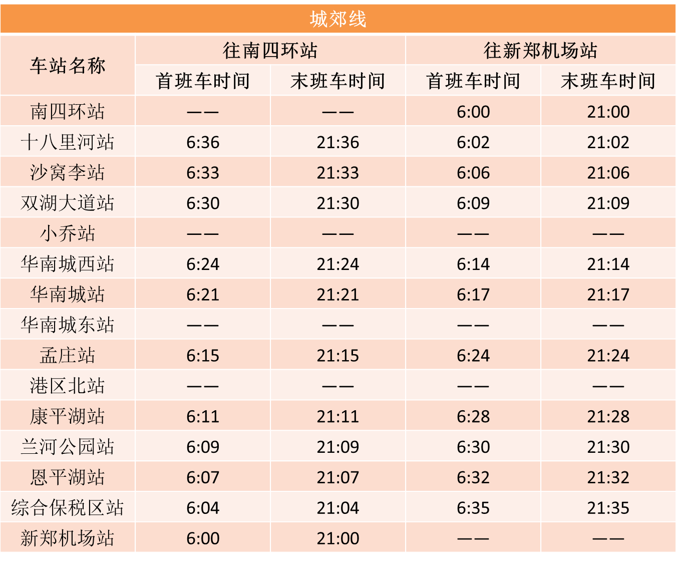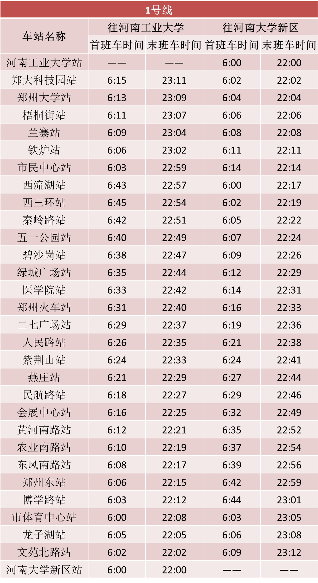 鄭州市發(fā)布最新通告,自2020年3月9日零時(shí)起,恢復(fù)機(jī)動(dòng)車限行。結(jié)合復(fù)工復(fù)產(chǎn)后逐步回升的客流情況,在嚴(yán)格做好疫情防控工作前提下,鄭州地鐵自3月9日起將調(diào)整全線網(wǎng)行車間隔。1號(hào)線、2號(hào)線、5號(hào)線行車間隔壓縮至高峰期8分鐘以內(nèi),城郊線行車間隔壓縮至高峰期16分鐘以內(nèi),14號(hào)線一期暫不恢復(fù)運(yùn)營(yíng)。線網(wǎng)已開通車站首末班車時(shí)刻表如下: